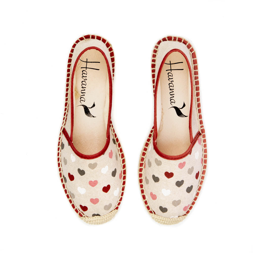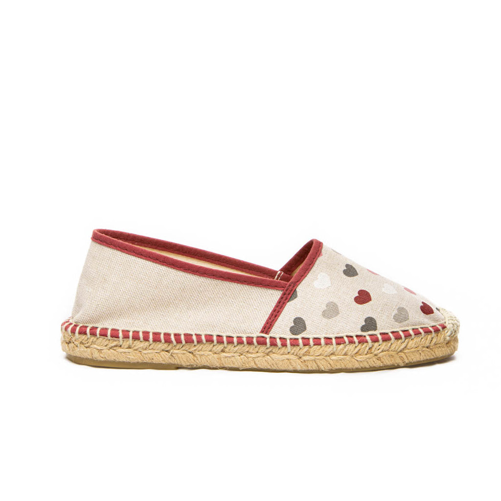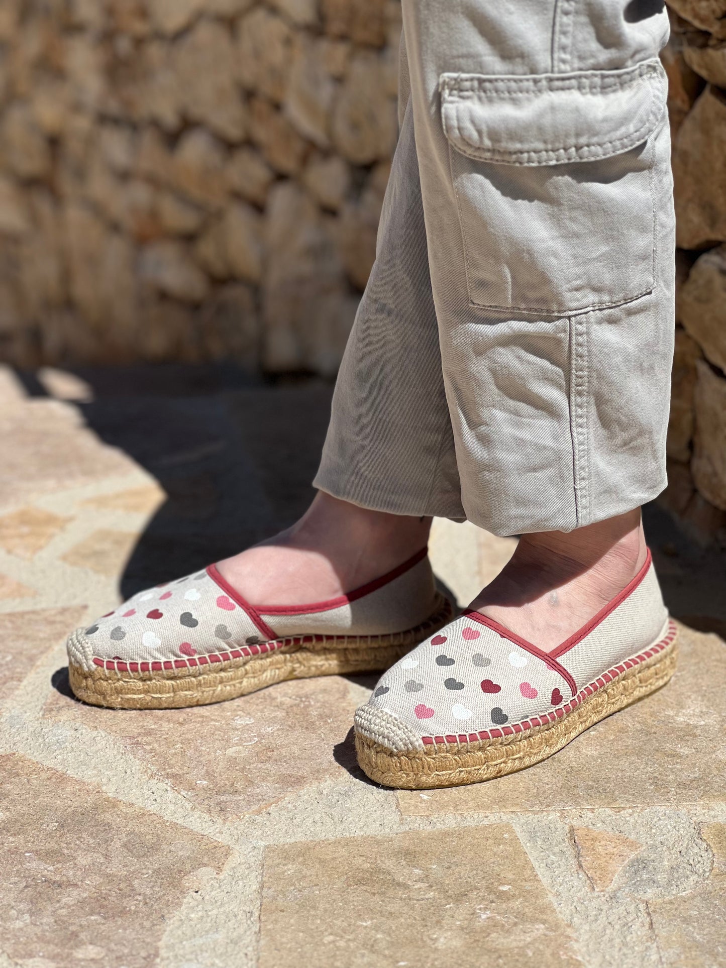 Alpargatas de mujer confeccionadas con loneta de algodón y con estampado de corazones sobre fondo color lino.