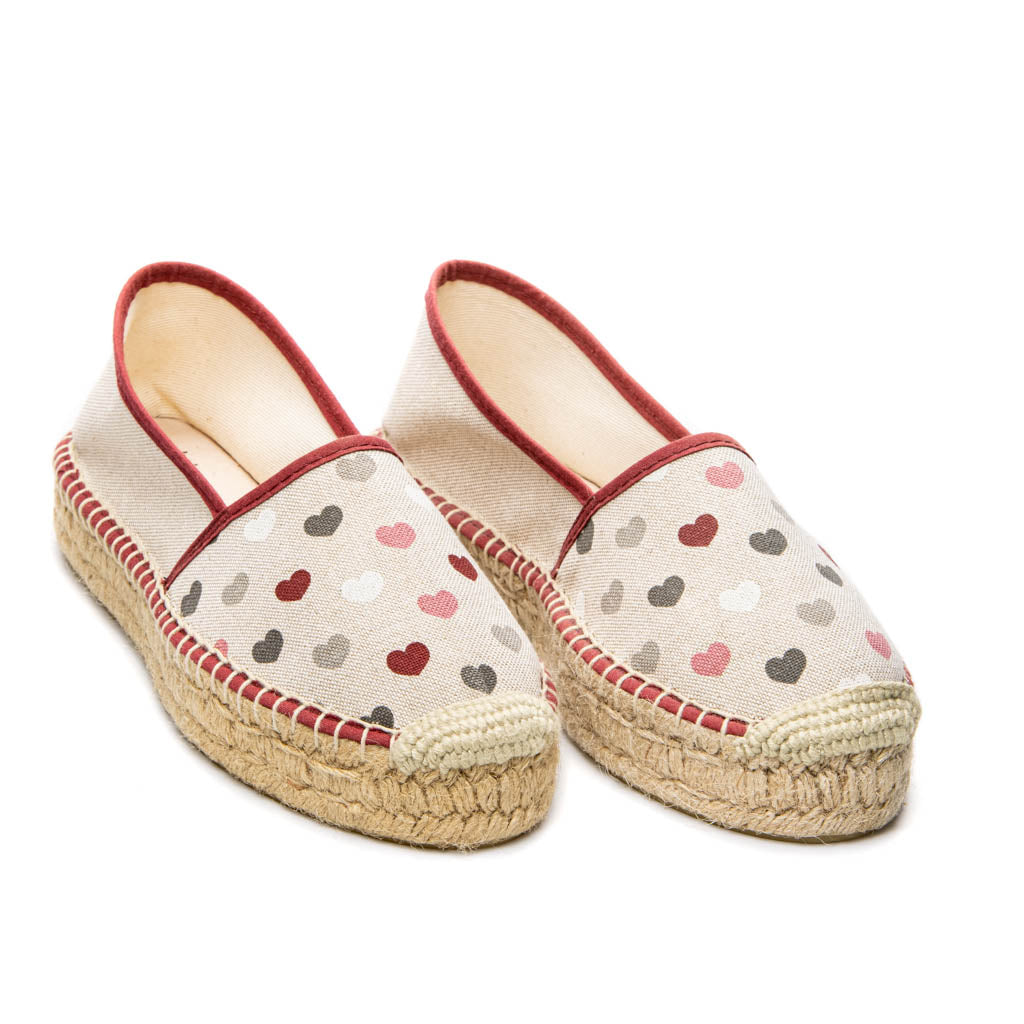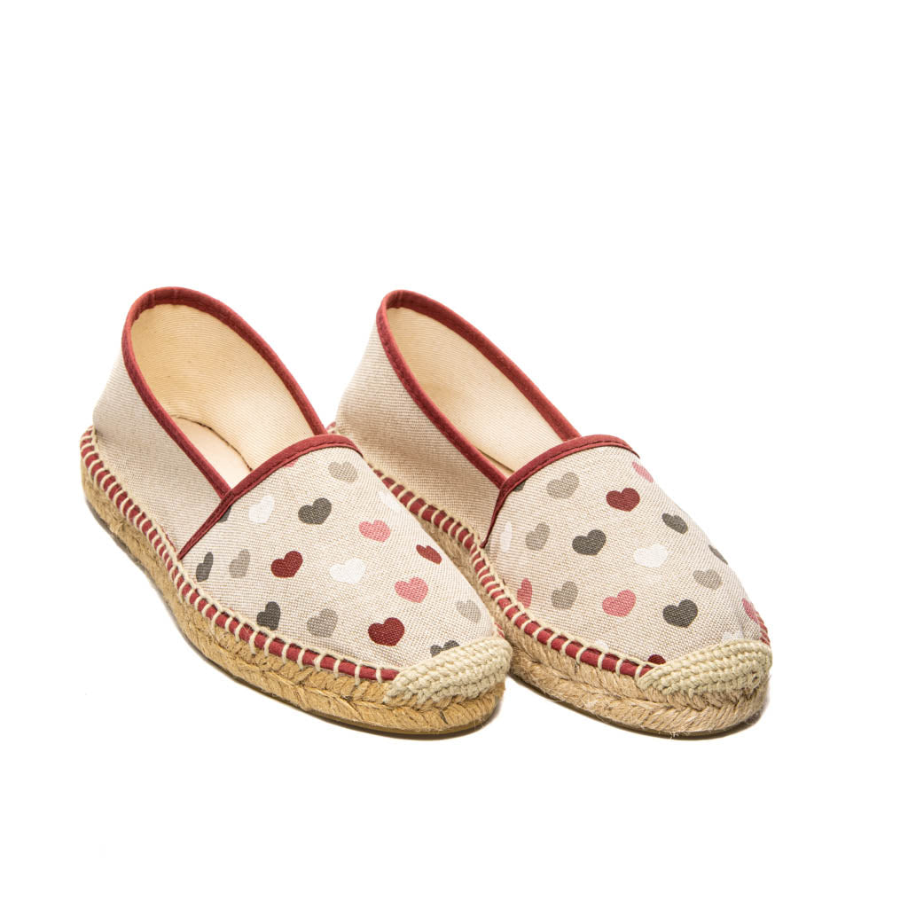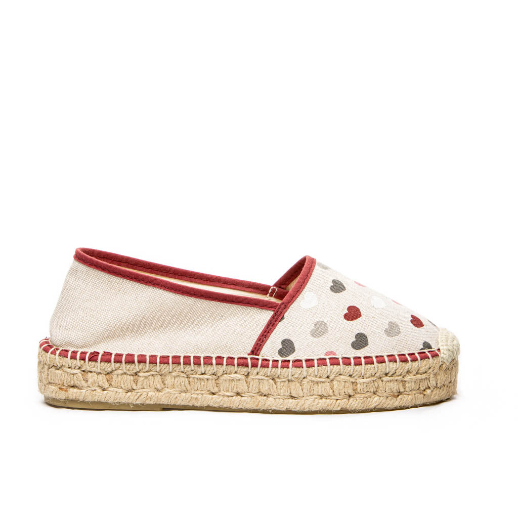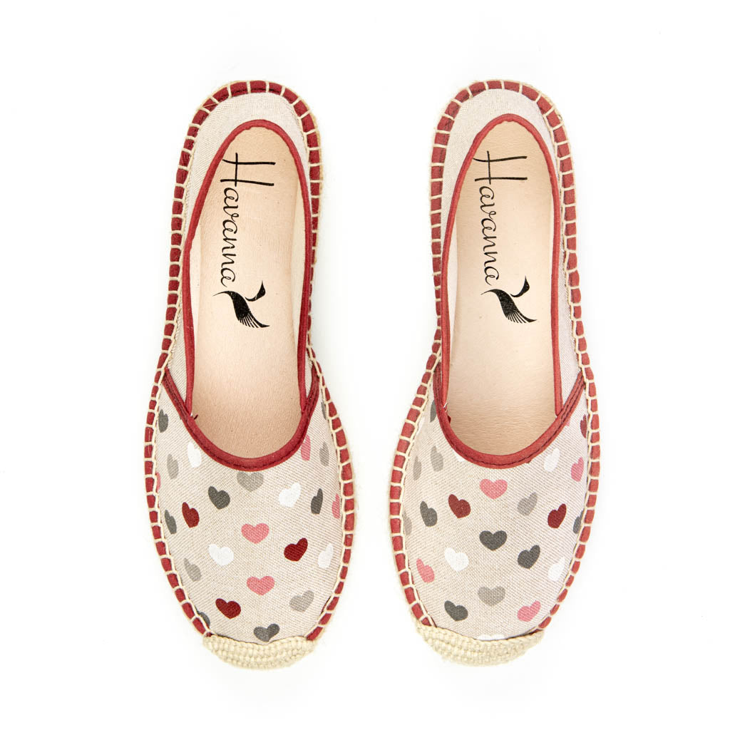 Alpargatas de mujer confeccionadas con loneta de algodón y con estampado de corazones sobre fondo color lino.