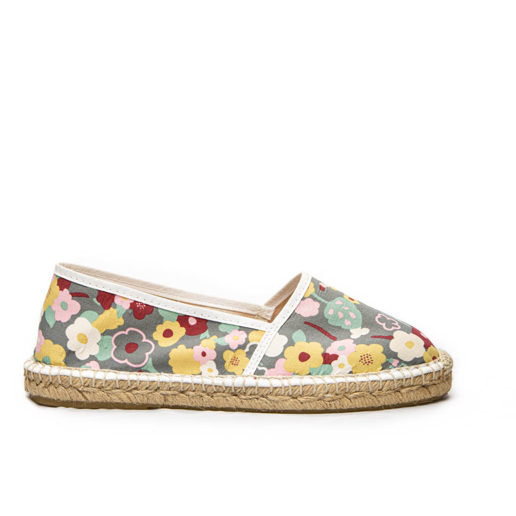 Women's espadrilles with sole jute natural, 2 cm high. Designed and made in our workshop, this model with a floral print is an ode to Spring . Another peculiarity of its print is that it is different on each foot, so each pair is unique and no two are alike.