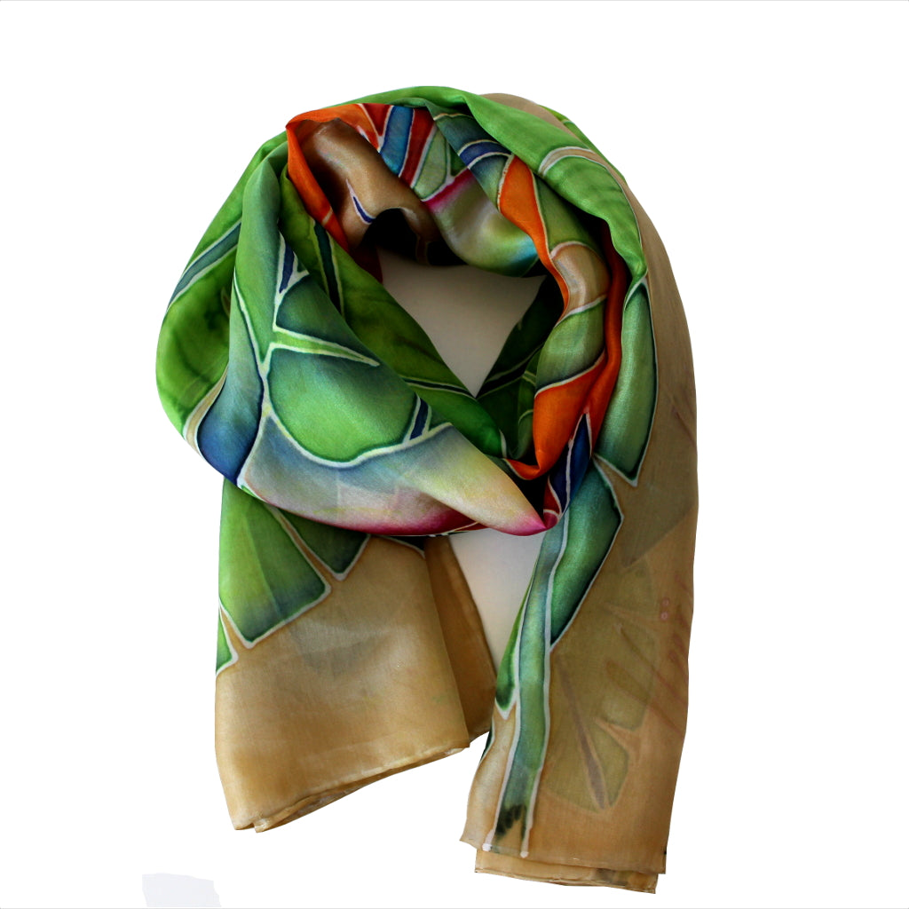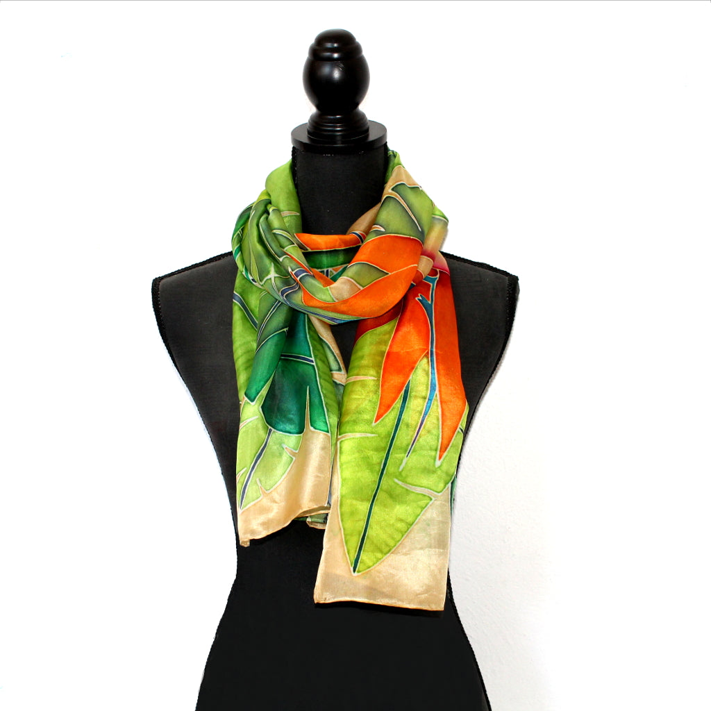 Hand-painted natural silk measuring 180 x 45 cm, with exclusive design since each print is unique, so no two pieces are the same.
