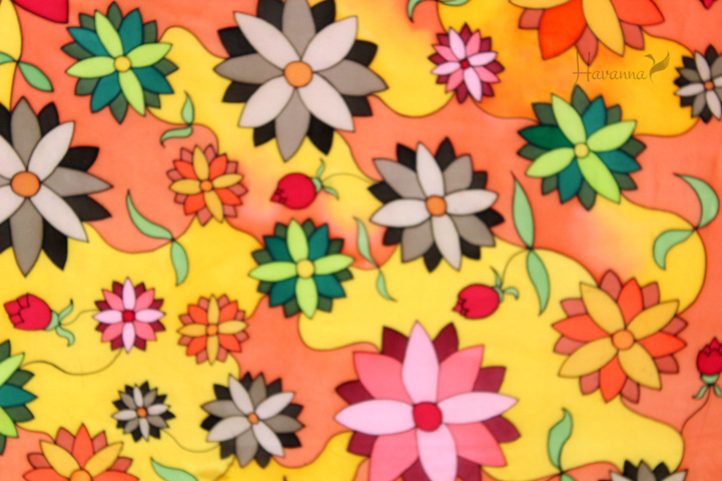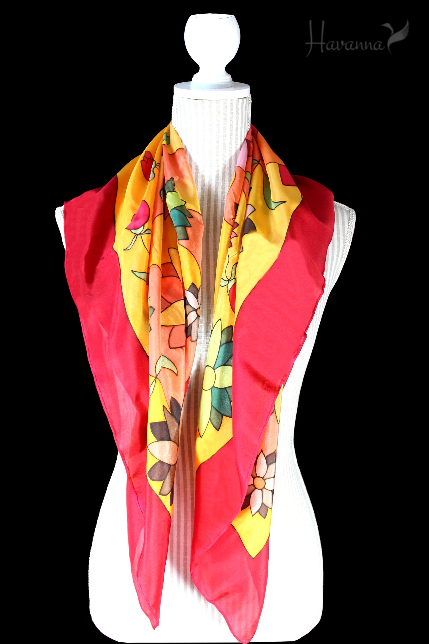 Hand-painted natural silk measuring 90 x 90 cm, with an exclusive design since each print is unique, so no two pieces are the same.