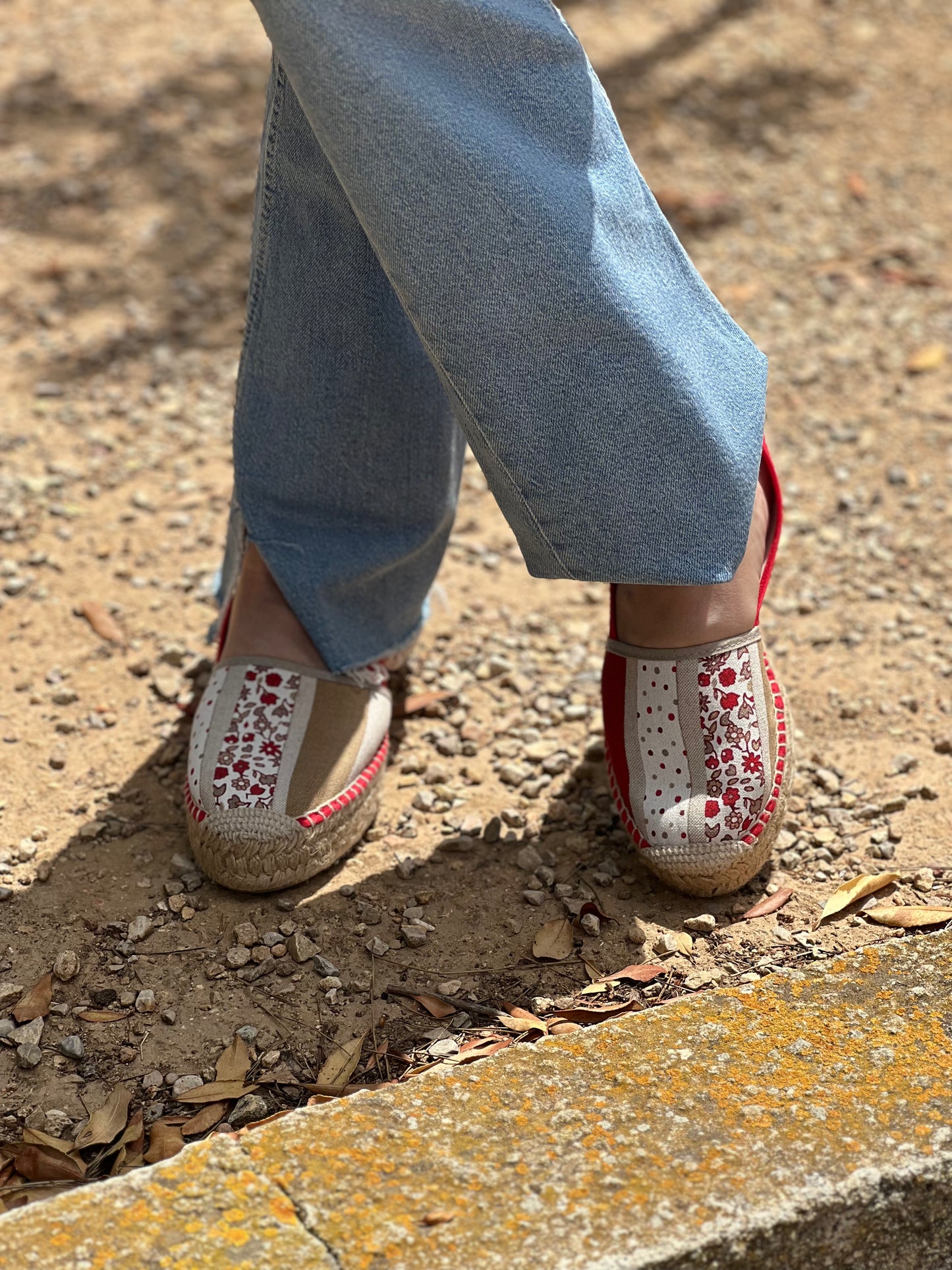 Alpargatas de mujer con suela de yute natural. Opción de suela sencilla de 2 cm o suela doble de 3 cm, para que optes por tu estilo preferido. Diseñadas y confeccionadas en nuestro taller, te presentamos un estampado que emula el patchwork en la parte delantera de la alpargata, con base en color rojo.
